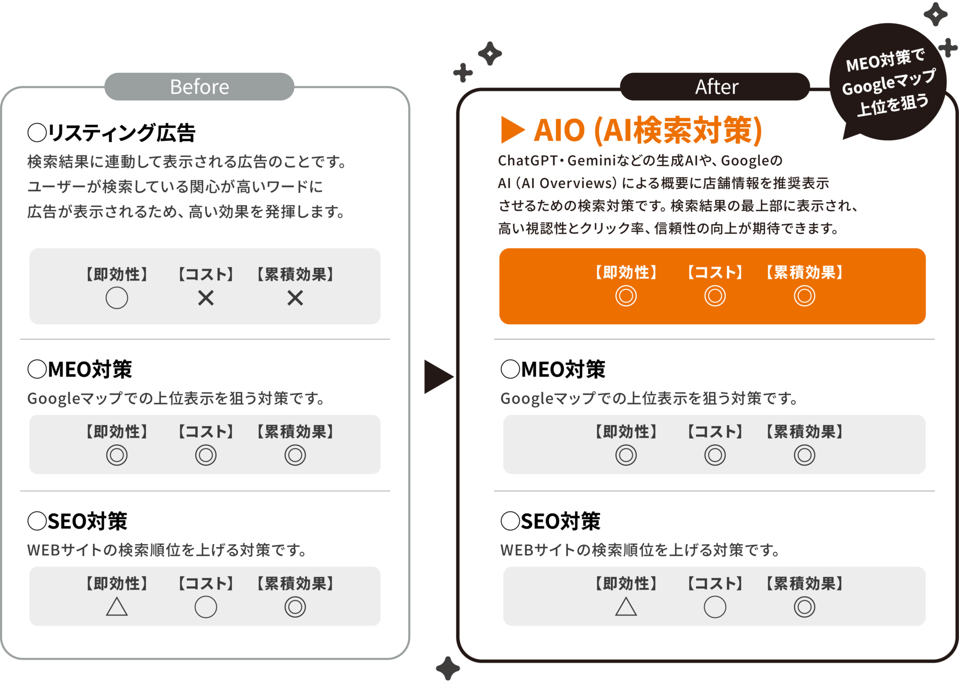 MEOが「Googleマップ内での表示順位」を整える施策であるのに対し、AIOは「GoogleのAIにおすすめされる状態」を目指す新しい対策です。